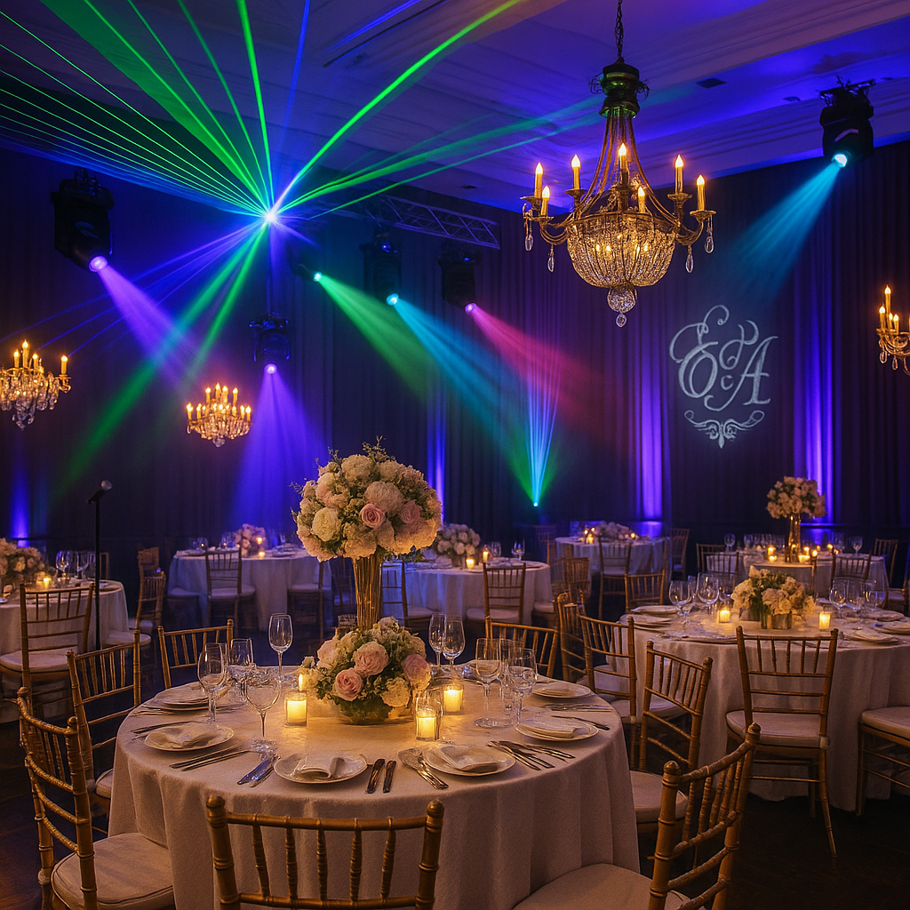 • Iluminación: ambiental, robótica, shows láser RGB, gobos personalizados.